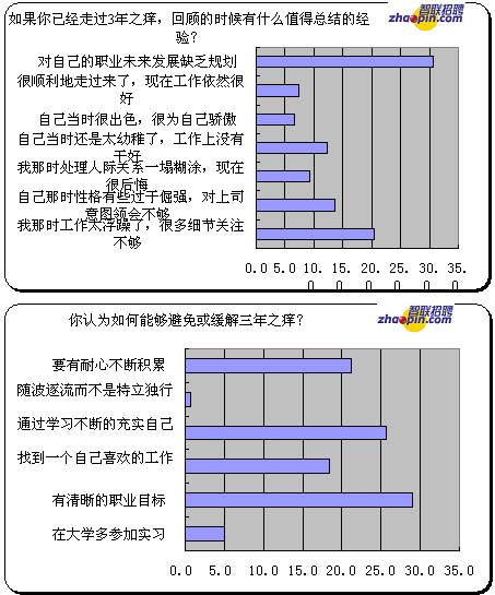 无论是走过三年之痒的人还是正在经受困惑的新人,蓦然回首,那痒却在职业规划处。如果你已经走过3年之痒,回顾的时候有什么值得总结的经验?对自己的职业未来发展缺乏规划的比例最高,是30.6%;其次是那时工作太浮躁了,很多细节关注不够 20.3%;那时性格有些过于倔强,对上司意图领会不够13.6%;自己当时还是太幼稚了,工作上没有干好12.3%;那时处理人际关系一塌糊涂,现在很后悔9.2%;自己当时很出色,很为自己骄傲6.6%;很顺利地走过来了,现在工作依然很好7.3%。