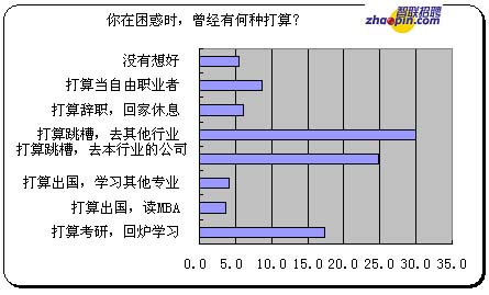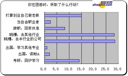 调查还显示,因三年之痒真的跳槽的比例也是最高的,对于"你在困惑时,采取了什么行动?"的问项,跳槽,去本行业的公司和去其它行业的比例不相上下,分别是28.6%和28.4%;考研,回炉学习的比例是14.1%;而实际出国读MBA或其它专业的比例比打算有所下降,分别是2.1%和1.0%; 真的辞职回家的比例高于打算部分,有8.3%;当自由职业者的比例实际是2.5%,大大低于打算部分的8.6%;打算创业自己做老板的比例不低,有15.1%。