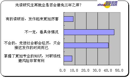 如果不工作,先读研究生再就业是否真的会避免三年之痒?,调查结果似乎并不乐观,认为不会的,走进社会都会经历,只会推迟发作的时间而已的有39.5%;不一定,看具体情况的有44.6%;认为掌握了更加专业的知识,对职场规避风险非常有利的只有7.5%;觉得的读研后,发作起来更加厉害的有8.5%。