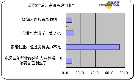 面对三年之痒,自己创业做老板如何?调查参与者在这方面的选择比较冷静,在关于"工作3年后,是否考虑创业?"的问项中,选择积累三年行业经验和人脉关系,开始要自己创业了的比例只有8.0;很想创业,但是觉得实力不足的高达72.9%;认为创业太难了,算了吧的有11.1%;等30岁以后再考虑的有8.0%。 创业是艰难的,创业者要具备勤奋、积极、乐观、谦虚、利他的心理素质和千里之行,始于足下的吃苦准备,另外投融资知识对创业来说也很重要,对于职龄三年来说,要具备自由翱翔商场的经验、能力和关系网,的确有点早。