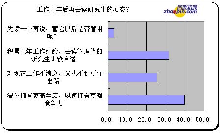 对于工作几年后再去读研究生的心态,渴望拥有更高学历,以便拥有更强竞争力 的比例最高,有39.8%;对现在工作不满意,又找不到更好出路的25.5%;认为积累几年工作经验,去读管理类的研究生比较合适的31.8%;盲目选择先读一个再说,管它以后是否管用呢的有3.0%。