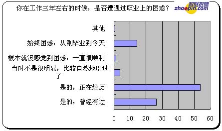 如果你开始对工作毫无兴趣,觉得前途模糊不清,你不是唯一的。调查中关于"你在工作三年左右的时候,是否遭遇过职业上的困惑?"的结果告诉我们你是99%中的一部分。选择"是的,曾经有过"的比例是26.3%;是的,正在经历53.8%;当时不是很明显,比较自然地度过了3.8%;根本就没感觉到困惑,一直很顺利的1.3%;始终困惑,从刚毕业到今天的14.3%;其他0.5%。