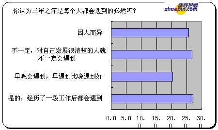 三年之痒是每个人都会遇到的必然吗?选择是的,经历了一段工作后都会遇到的27.1%;选择早晚会遇到,早遇到比晚遇到好的20.4%;不一定,选择对自己发展很清楚的人就不一定会遇到的是不是26.7,认为还是因人而异的比例是25.7%。