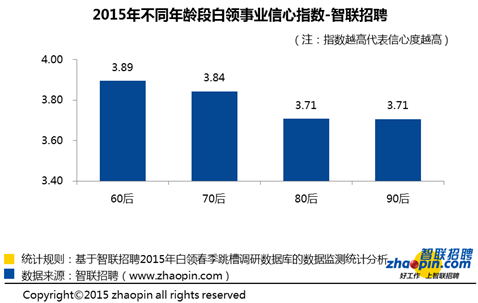 智联招聘此次调查还发现,相较职场前辈,80和90后信心明显不足。有73.1%的60后白领表示对新年事业更有信心。相对而言,80后及90后的信心指数要远低于他们的前辈,仅有60.2%与60.1%的白领表示出了有信心或者非常有信心。