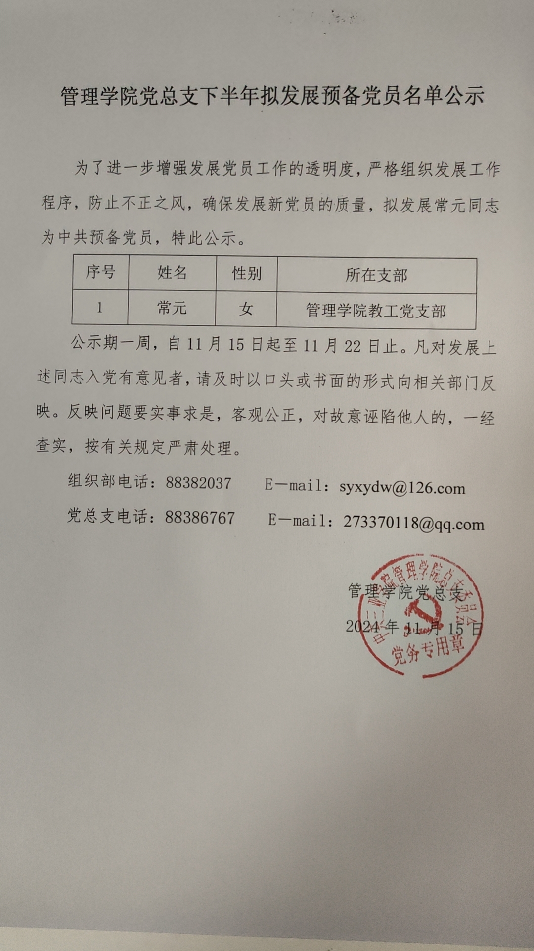 管理学院党总支下半年拟发展预备党员名单公示