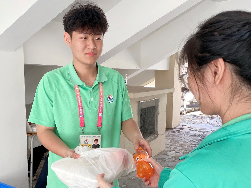 在参加这次运动会的志愿服务中,我主要负责餐饮、食品保障方面的工作,负责发餐、盛汤、发水果和饮料。在工作中我能清楚的感到帮助他人的喜悦,虽然很辛苦但我深感一切努力都值得。这段经历不仅丰富了我的人生,更让我明白了责任与担当的意义。