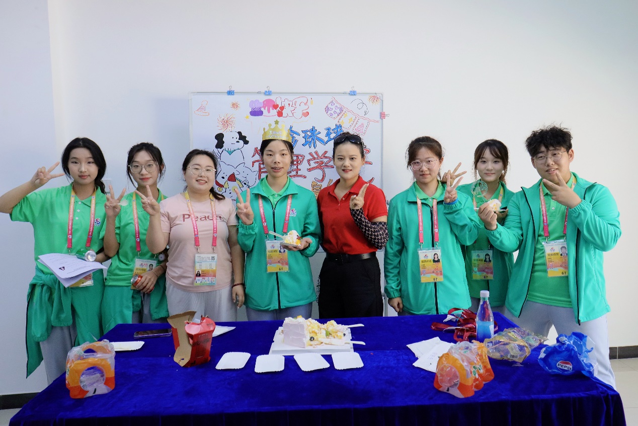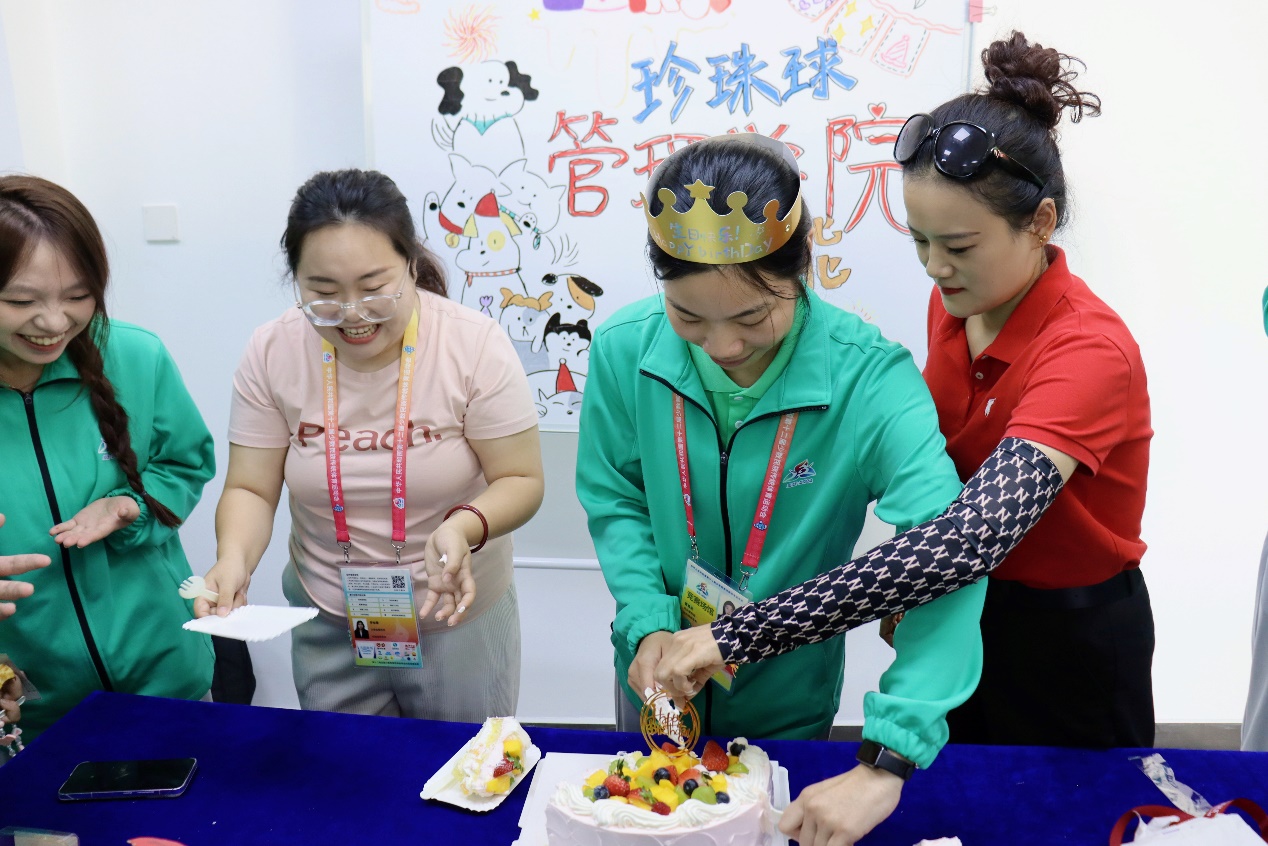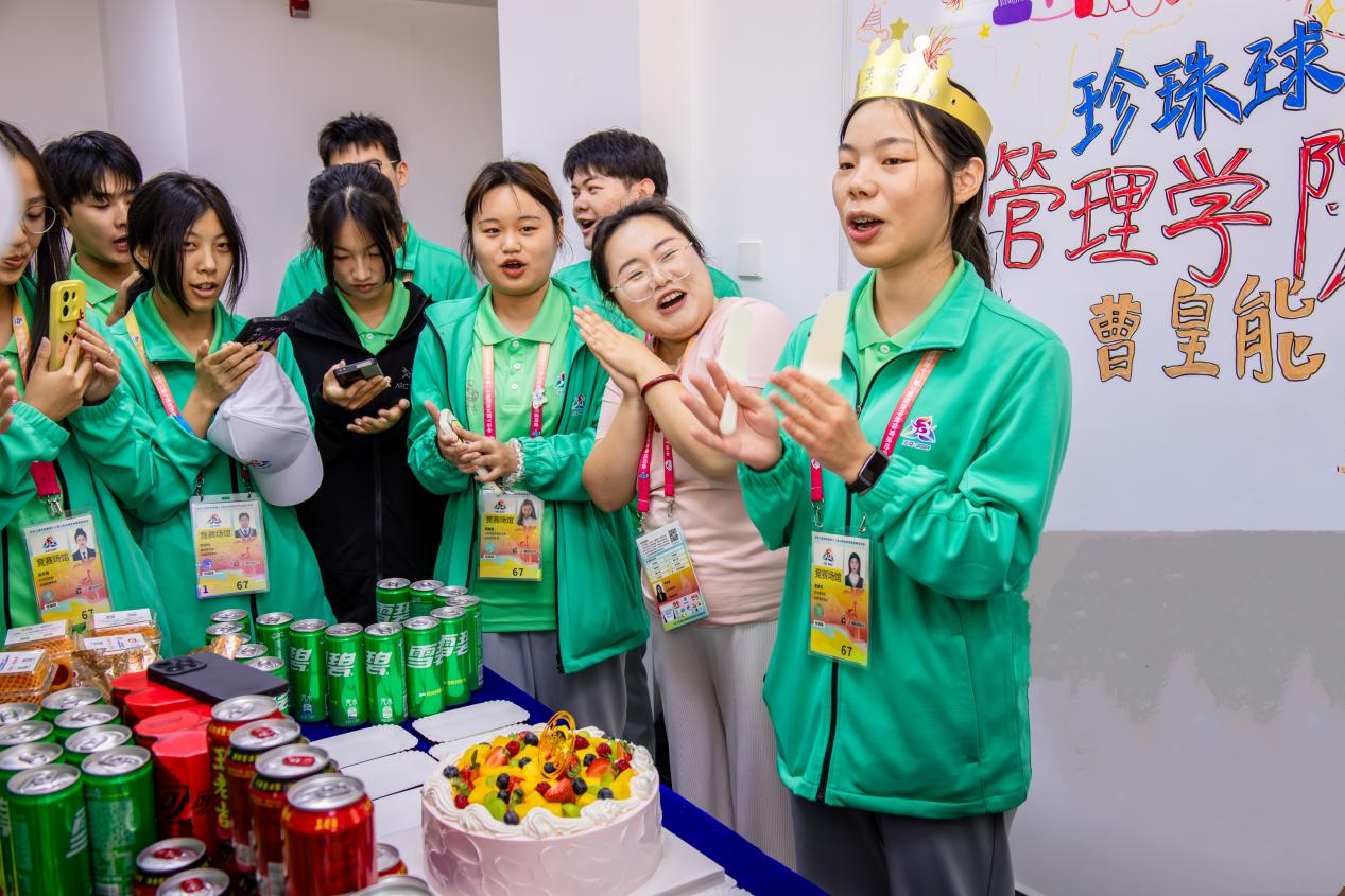 当天中午12时,在志愿者志愿服务工作结束即将返程之际,我院团委副书记王娜老师代表共青团三亚学院管理学院委员会,来到珍珠球比赛场馆——三亚技术学院的志愿者之家,看望慰问我院全体志愿者,并与全体志愿者一起,为当天过生日的志愿者,工商2301班的曹皇能同学庆生。