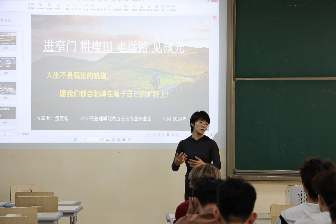 12月3日上午,在书新五号楼204教室,物流2201班的专业课课堂迎来了一位特别的嘉宾——物流管理专业2019届优秀校友孟亚智。任课教师李峰老师精心策划了这次活动,邀请孟亚智学姐重返母校,为学弟学妹们带来了一场真挚且充满力量的创业经验分享及创业指导讲座。