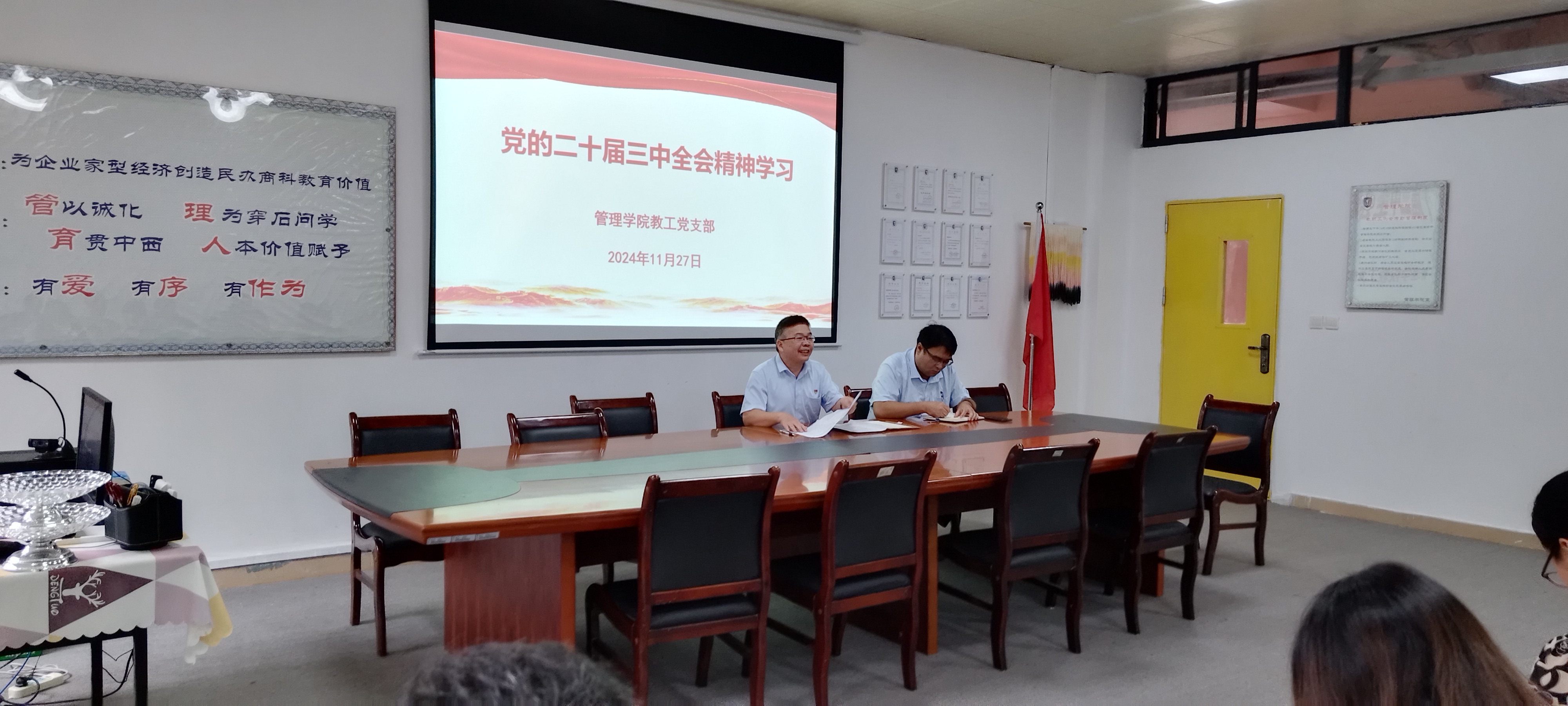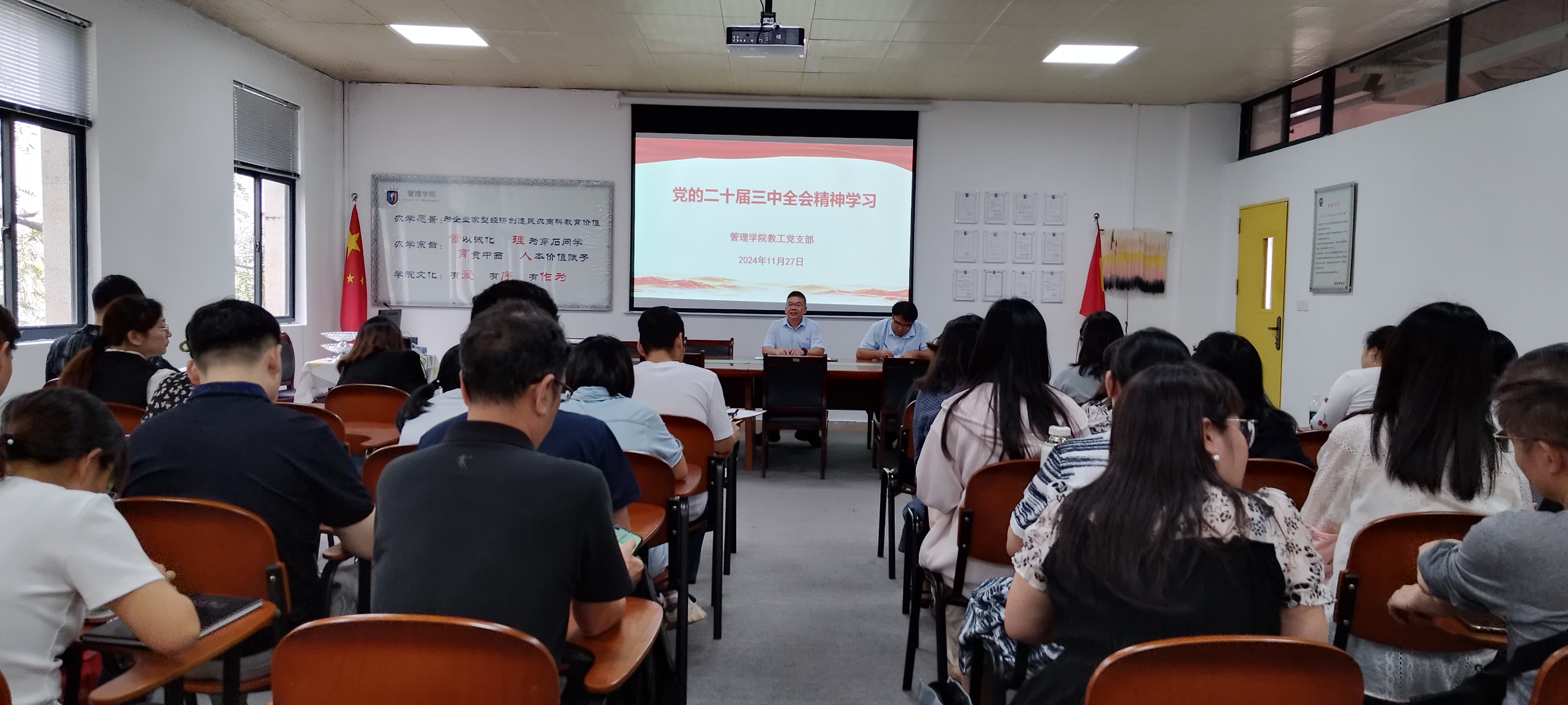 根据上级党组织工作安排,管理学院教工党支部于11月27日下午在学院会议室开展党的二十届三中全会精神集中学习,本次学习由学院党总支书记戴盛才主持,支部全体党员参加。
