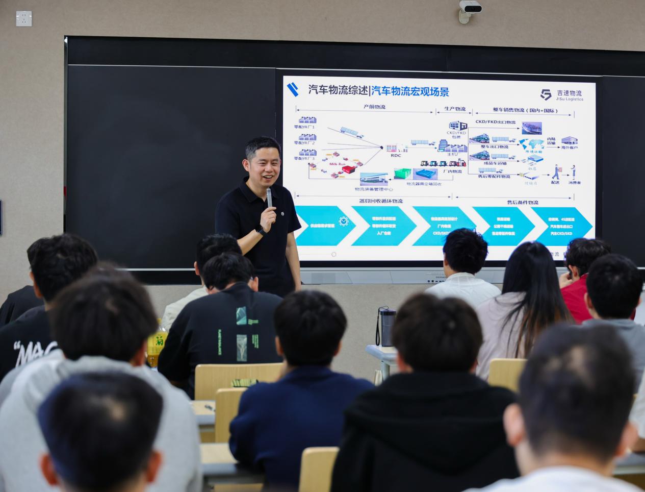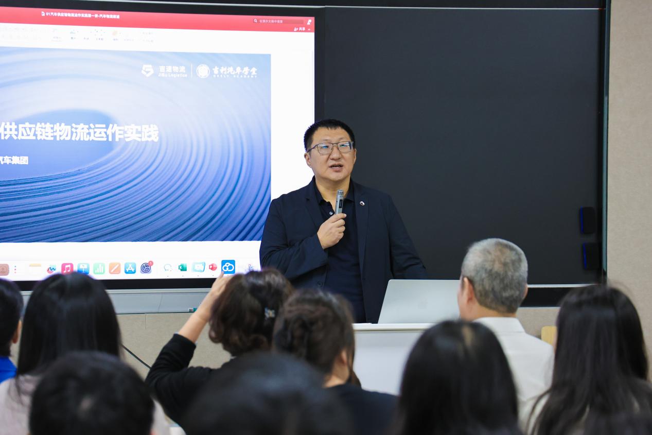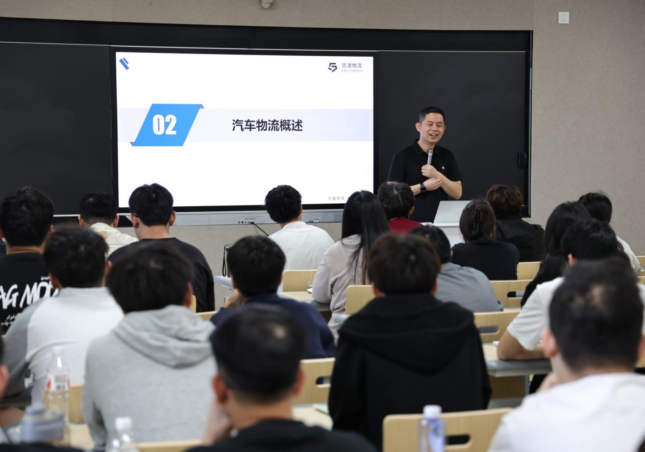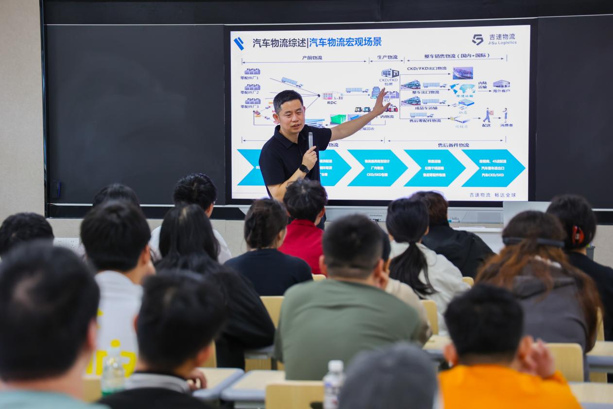 紧接着,黄总开始精彩授课。黄总凭借自身在浙江吉利汽车集团丰富的实践经验,全面讲解了汽车供应链物流的运作模式,他从物流的定义及发展、汽车物流概述到精益生产与物流改善,结合实际案例剖析了其中的关键环节与创新策略,让同学们对汽车供应链物流有了更直观、更深入的理解。