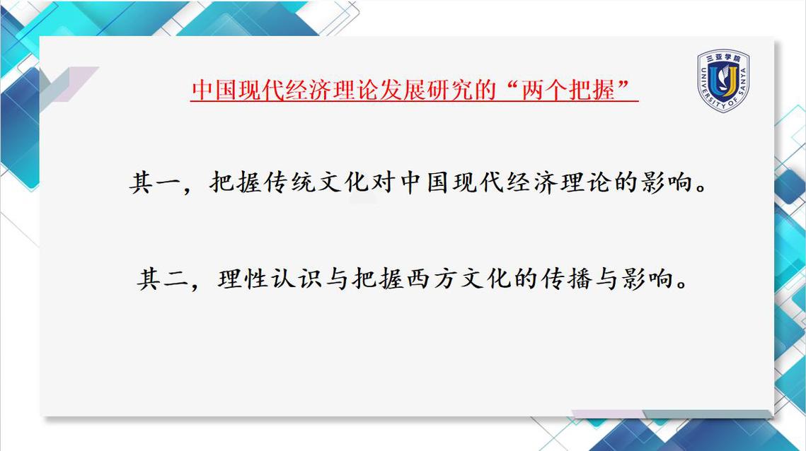 此外,陈教授还详细阐释了中国现代经济理论的“八大”发展趋势,并分享了中国现代经济理论发展研究的“两个把握”等内容。他提到,中国现代经济理论既继承和发扬了优秀的传统文化遗产,又兼容并蓄了各国优秀文化,其发展的基本趋向是把握原则、立足国情,逻辑导向、推陈出新,中西结合、与时俱进。