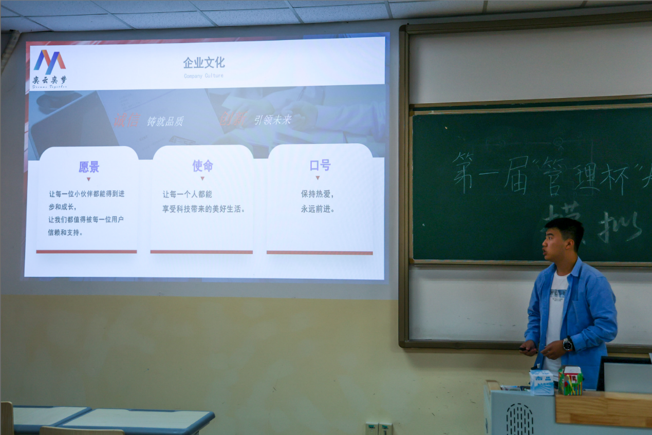 “奕云奕梦队”队长工商2201李军豪介绍本公司logo和文化