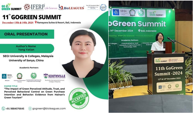 三亚学院管理学院人力资源管理专业教师、马来西亚世纪大学在读博士生杨雅恬,于2024年12月13日至14日在印度尼西亚巴厘岛举行的第11届Go Green Summit上发表了口头报告。该会议由BioLeagues主办,是一个国际性的学术交流平台,旨在汇聚全球环境科学和可持续发展领域的专家学者,共同探讨和分享最新的研究成果和实践经验。