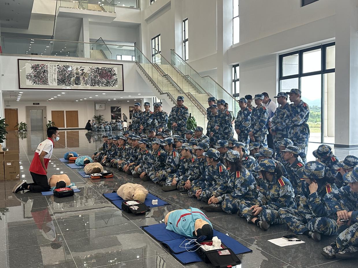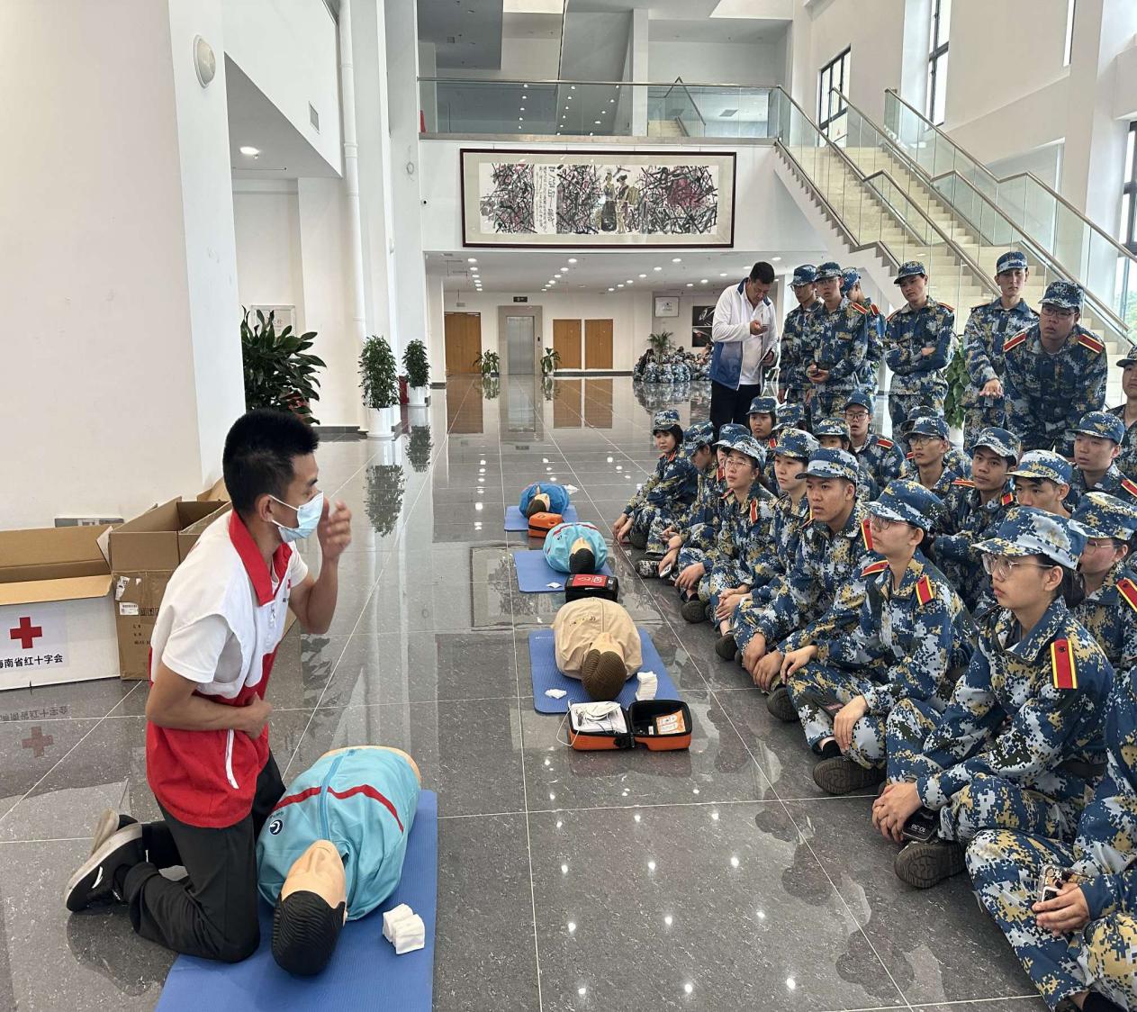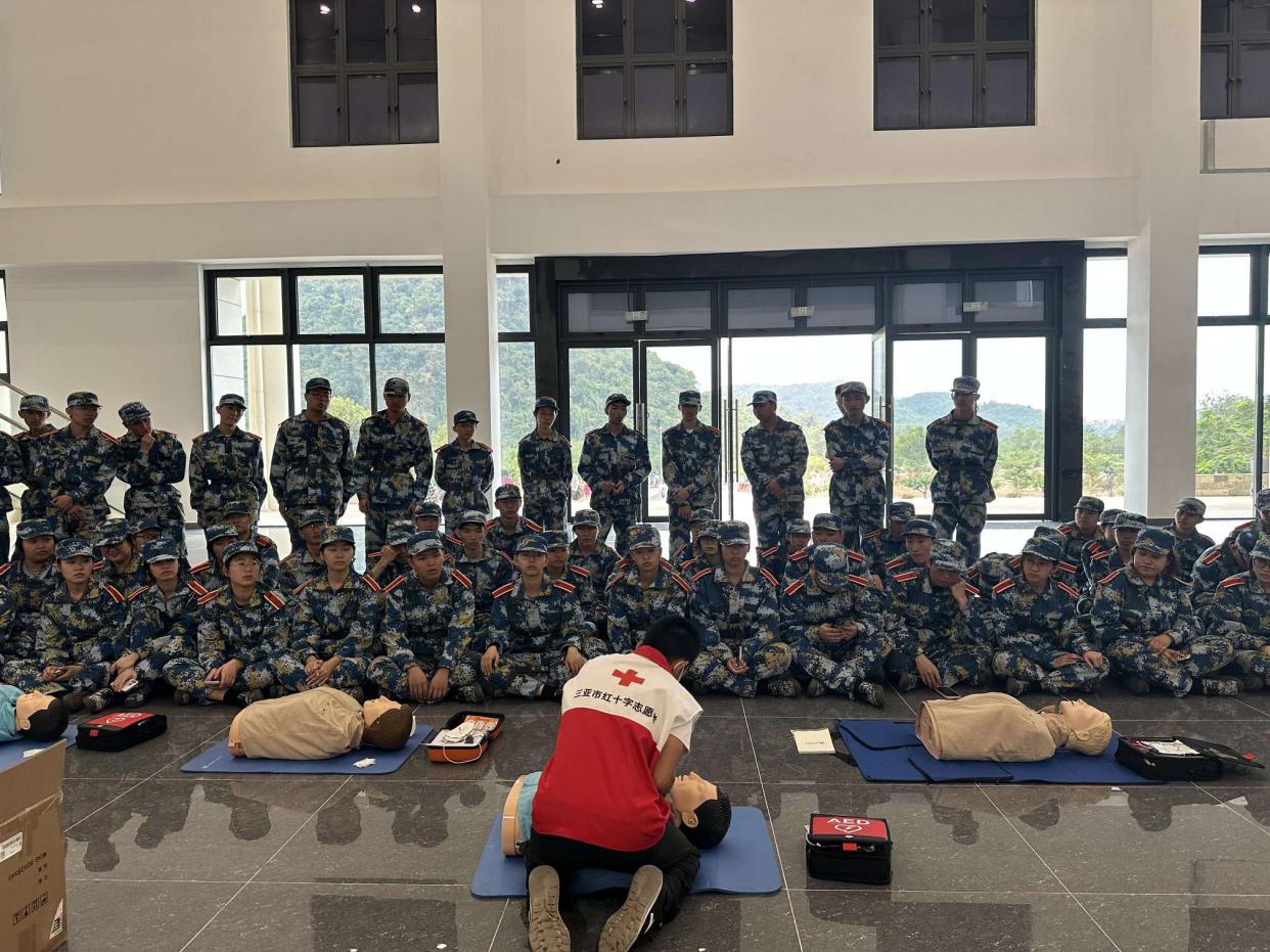训练间隙,三亚市红十字会的志愿者团队携带着模拟人、急救箱等专业设备整齐亮相。培训伊始,志愿者们以生动易懂的语言,结合校园内外常见的突发状况,深入浅出地讲解了急救的重要性与基础理论,如心肺复苏、海姆立克急救法等关键知识。同学们的眼神中满是专注与好奇,迅速被带入了这个关乎生命的学习情境之中。