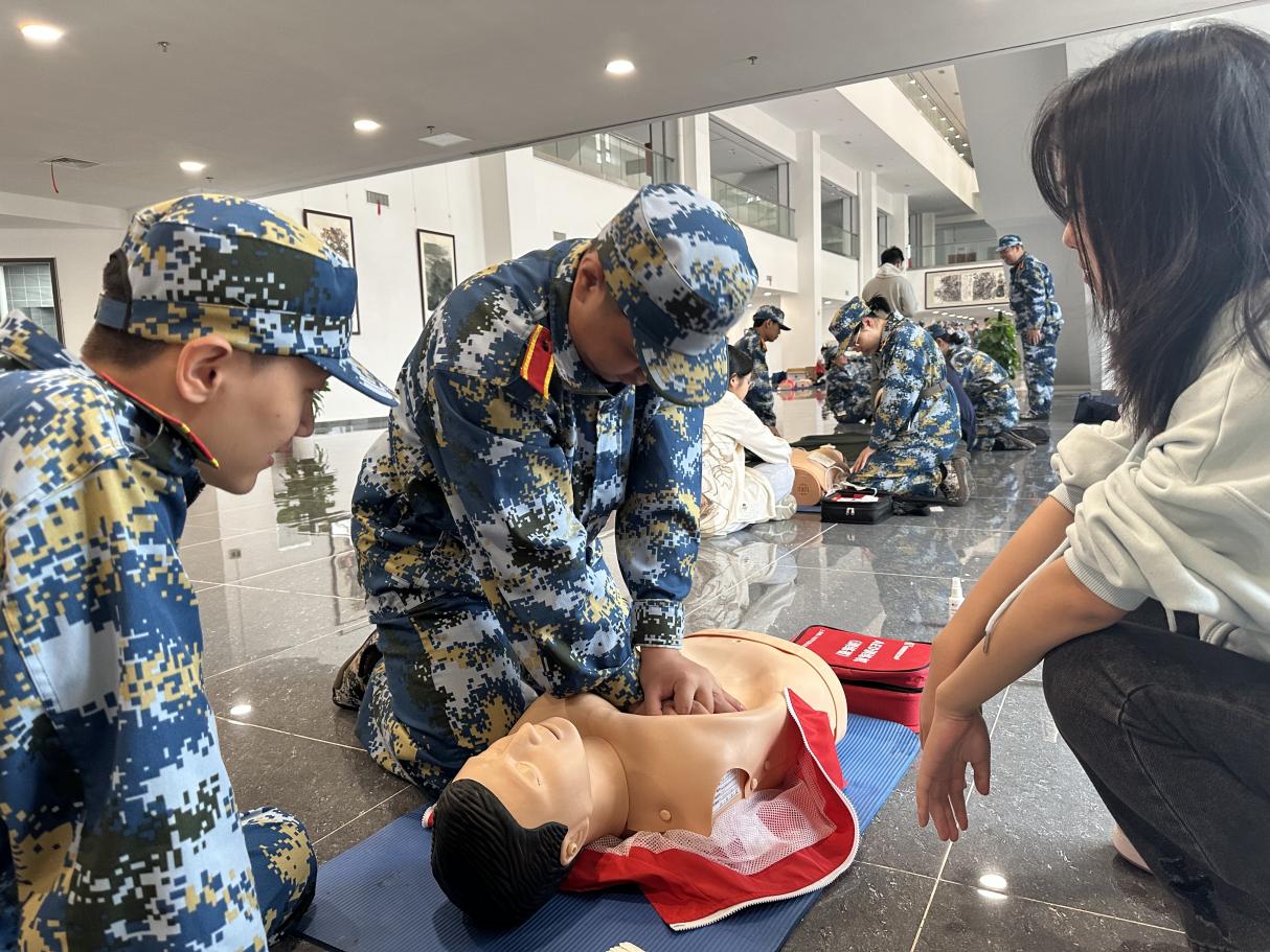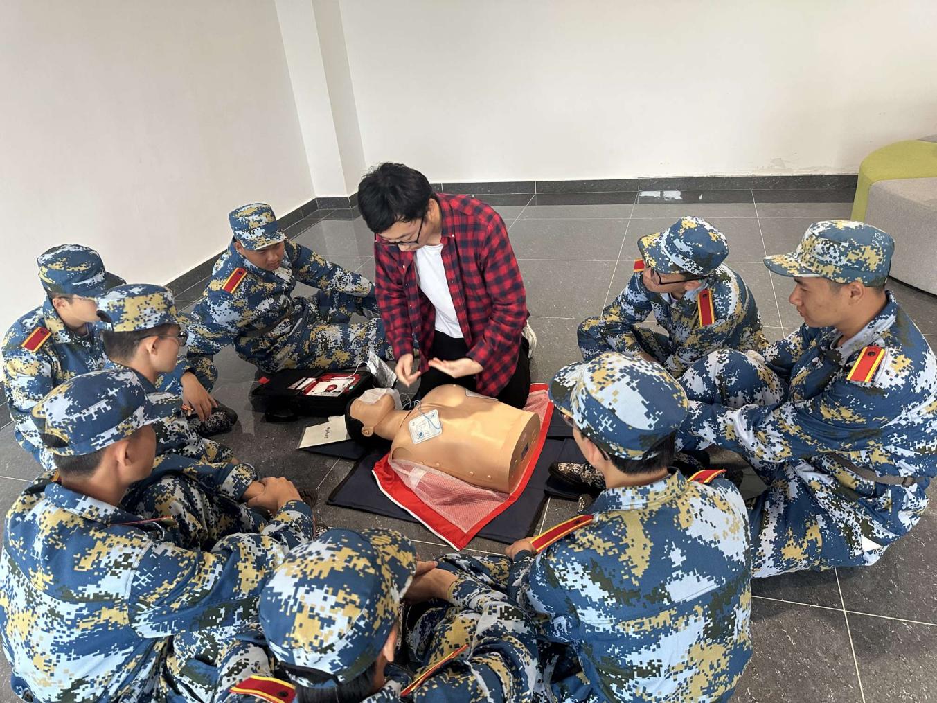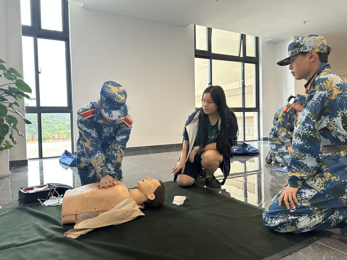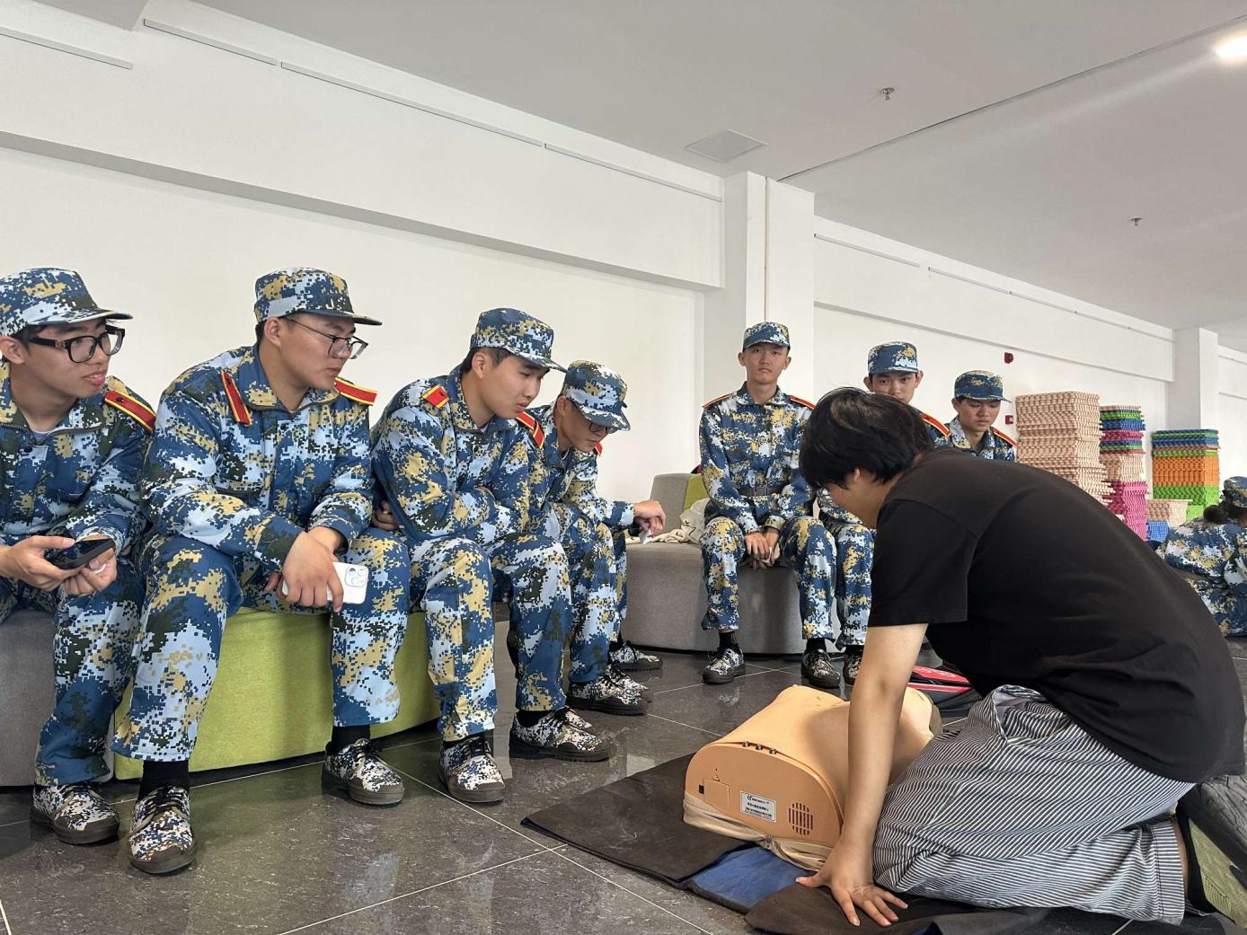 训练间隙,三亚市红十字会的志愿者团队携带着模拟人、急救箱等专业设备整齐亮相。培训伊始,志愿者们以生动易懂的语言,结合校园内外常见的突发状况,深入浅出地讲解了急救的重要性与基础理论,如心肺复苏、海姆立克急救法等关键知识。同学们的眼神中满是专注与好奇,迅速被带入了这个关乎生命的学习情境之中。