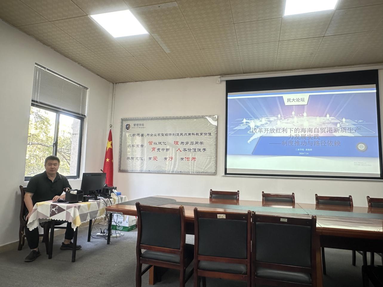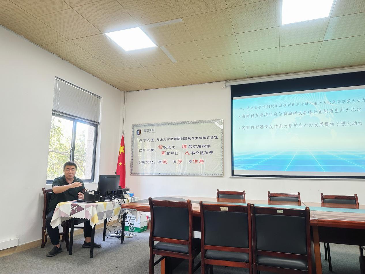 12月18日下午,在社科楼206教室,我院成功举办了一场主题为“改革开放红利下的海南自贸港新质生产力发展实践”的专题学术交流会。本次交流会由黄晓野老师主讲,院领导及中青年教师共同参加。