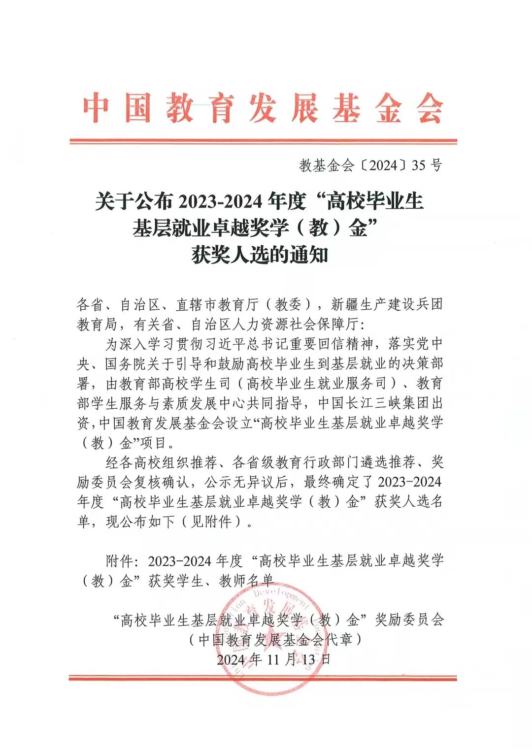 据悉, “高校毕业生基层就业卓越奖学(教)金”是由教育部高校学生司、教育部学生服务与素质发展中心共同指导,中国长江三峡集团出资,中国教育发展基金会设立的项目,主要奖励赴基层就业并做出突出业绩的普通高校毕业生和普通高校指导服务大学生赴基层就业工作有突出贡献的教师。本学年共评选出“高校毕业生基层就业卓越奖学金”398人。