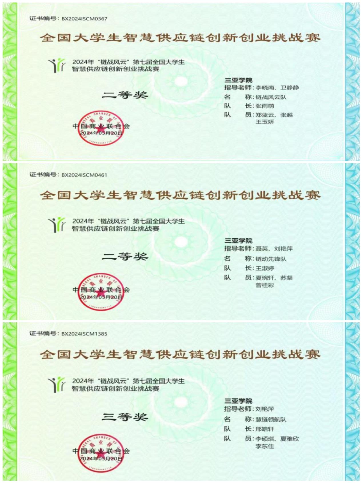通过一系列精心设计的课程和实践项目,传化供应链产业学院的学生们不仅掌握了扎实的专业知识,还培养了团队协作、创新思维和解决实际问题的能力。本年度,学生在各类学科竞赛中屡获佳绩,充分展示了学院在人才培养方面的卓越成效。如2024年5月18日,在第七届全国大学生智慧供应链创新创业挑战赛中,三亚学院管理学院物流管理专业学子组成的链战风云队、链动先锋队、慧链领航队,分别荣获全国二等奖。优异成绩的取得展示了学院人才培养的质量和水平。