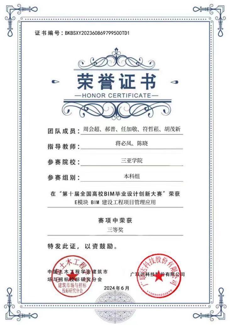 喜报:三亚学院工程管理专业在全国广联达BIM毕业设计大赛中荣获一项全国三等奖,两项全国优秀奖