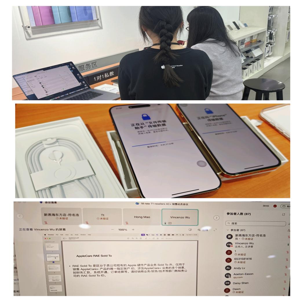 在实习期间,卢玉嫒同学首先深入学习了苹果产品的各项功能和技术特点。通过与资深销售人员的交流和实际操作,她不仅掌握了产品的基本性能,还了解了苹果生态系统的优势,如设备之间的无缝连接和协同工作。这些知识让她在工作中更加自信,也为之后独自接待客户打下了坚实的基础。