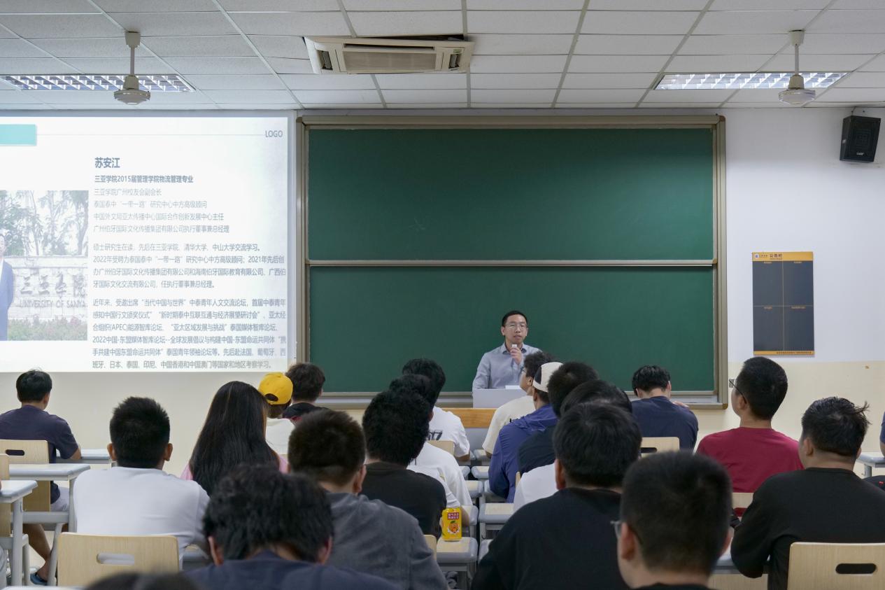 3月12日,管理学院书新五号楼迎来了一场别开生面的分享会。本次分享会由管理学院2015届毕业物流管理专业优秀校友、中国外文局亚太传播中心国际合作创新发展中心(广州伯牙国际文化传播集团有限公司)负责人苏安江主讲,吸引了2022级物流管理专业80余名学子积极参与。