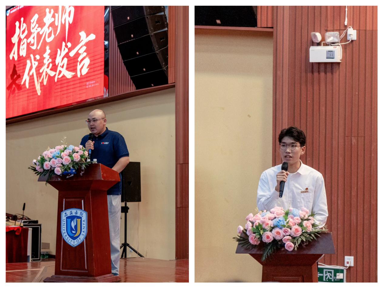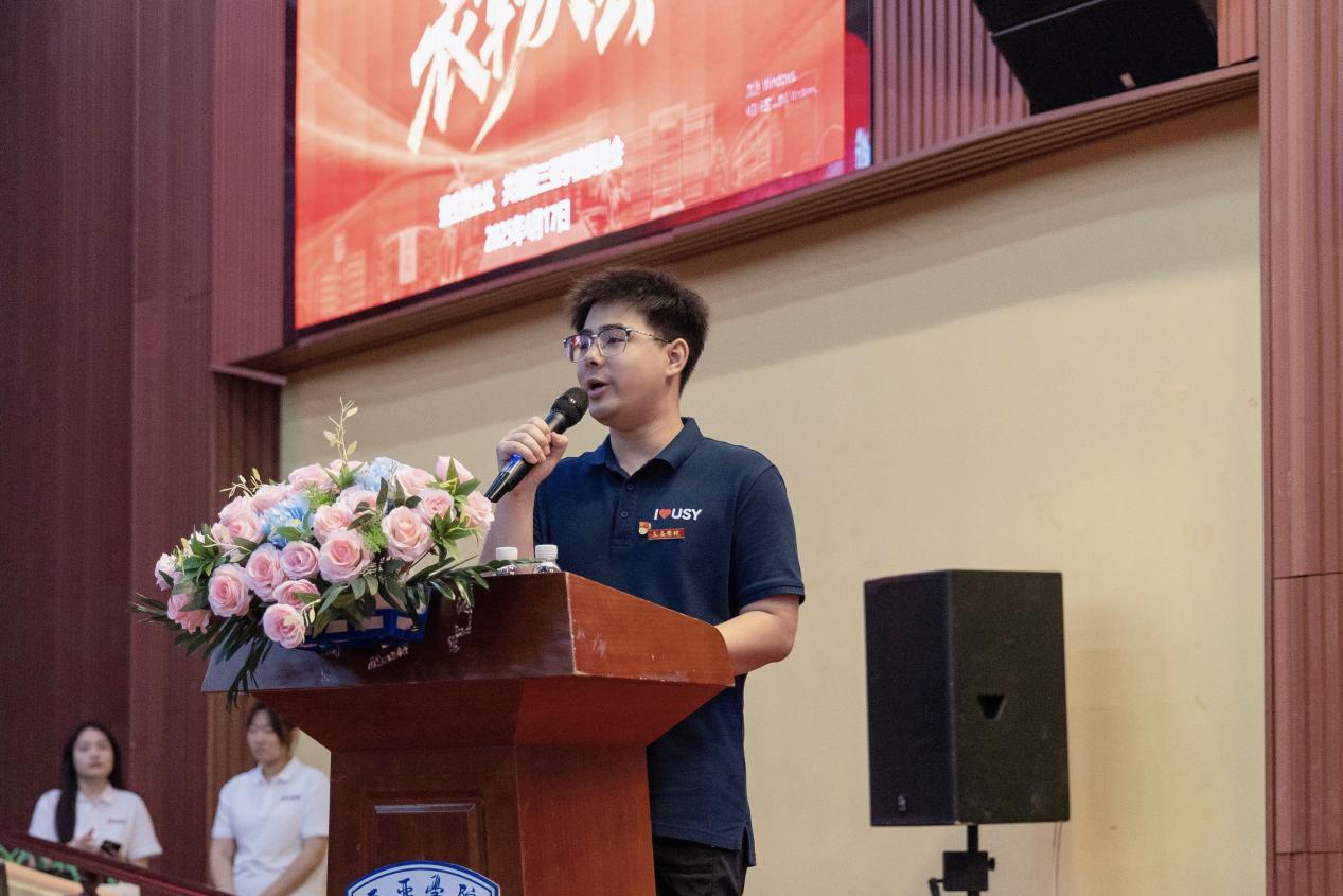 在经验分享环节,志愿者代表和指导老师代表上台发言。马克思主义学院郭志恒同学生动地讲述了如何将三亚学院的育人理念巧妙地传递给母校的学弟学妹,并将思政课融入其中,郭志恒同学的分享,不仅展示了志愿者的智慧与才华,更为其他同学提供了宝贵的借鉴和启示。财经学院鞠岳坤老师分享了学院在组织活动过程中的成功做法和宝贵经验赢得了大家的热烈掌声。