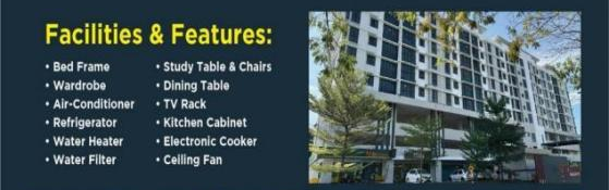 申请人可以申请拉曼大学宿舍,其中双溪龙校区 Azalea Accommodations 公寓,带连接浴室的主卧双人间1000RM/月(500RM/人/月),高级单人间800RM/月,单人房600RM/月(以上租金均以一年合同为基础)。清洁费:100RM;申请费:200RM。学生亦可自行申请学校周边其他宿舍,须自行咨询,住宿费用自理。