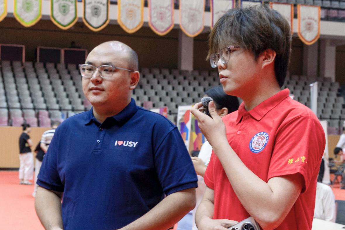 管理学院物流2301班郑扬同学(右一)担任特色专业推介会(书艺馆)环节学生主播