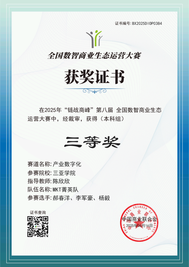 近日,2025年“链战商峰”第八届全国数智商业生态运营赛圆满落幕。我院数字营销专业营销2301班郝春洋同学带领的参赛团队,在陈欣欣老师的指导下,凭借在产业数字化赛道(品牌数字化运营方向)的出色表现,成功斩获全国三等奖。