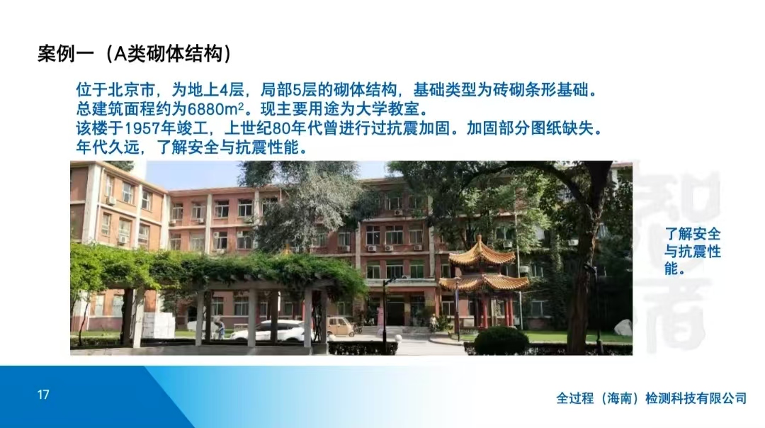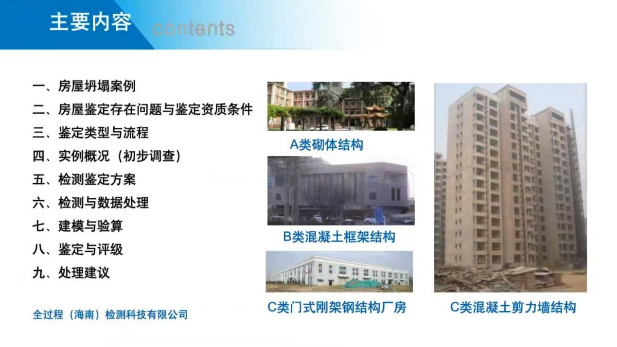 最后,萧雄老师以A类砌体结构、B类框架结构、C类剪力墙结构和门窗厂房等实例展开讲解,阐述了初步调查目的、方式,以及检测鉴定方案要点、检测与数据处理等内容。