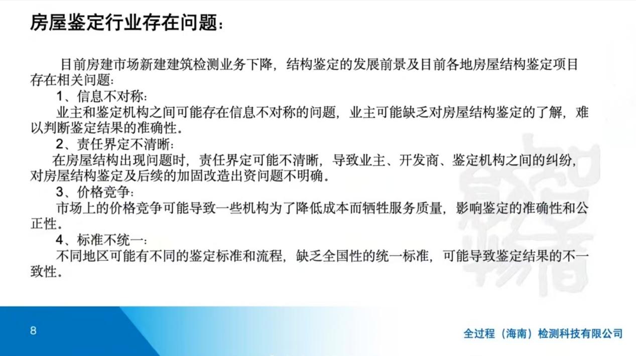 接着,萧雄老师剖析了房屋鉴定行业存在的问题,包括信息不对称、责任界定不清晰、价格竞争、标准不统一等,并详细阐述了从事房屋安全鉴定应具备的资质条件,如专业技术人员、资质认证、技术标准和规程等。