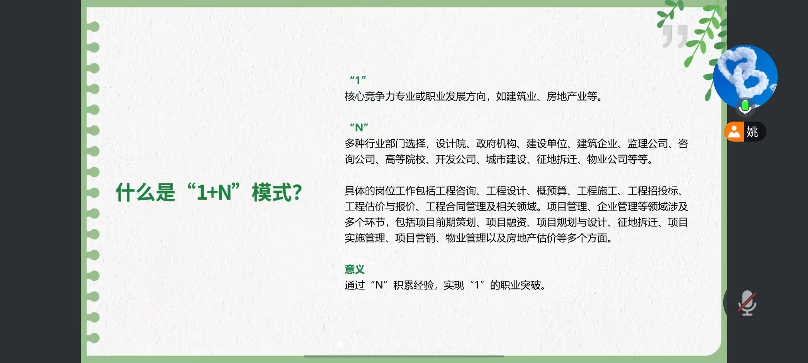 6月13日14:50,管理学院工程管理专业“1+N”模式课程(英文名:1 + n in Engineering Management )通过腾讯会议开展线上教学。本次课程面向技术造价2401、工程2401、工程2402班级,由三亚市城市规划设计研究院有限公司规划室副主任姚雪溪授课,为学生系统呈现工程管理领域多元职业生态与发展路径。