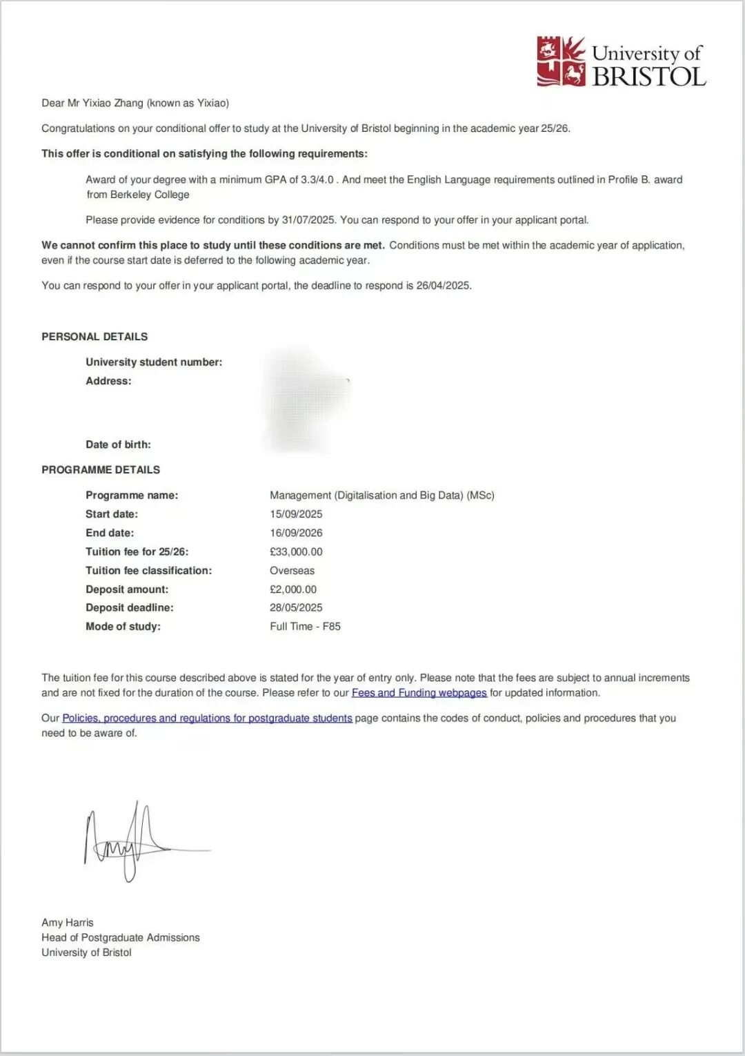 不管在哪,提升自身能力都是关键。申请时,要根据不同地区准备资料、规划时间,实习经历和科研成果能为申请加分,一定要关注官网的申请截止时间。大学期间,保持高GPA是敲开名校大门的关键。最后,我还想对犹豫的学弟学妹说,要遵从内心和兴趣做选择。在这里也想感谢学院和家人的支持,并祝愿母校越来越好!