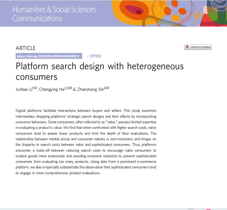 近日,三亚学院盛宝金融科技商学院名誉院长、金融创新与多资产智能交易海南省哲学社会科学重点实验室主任何诚颖教授,与上海交通大学史占中教授、深圳大学李俊宝博士合作撰写的研究论文 Platform search design with heterogeneous consumers 正式发表于Nature 子刊 Humanities & Social Sciences Communications。