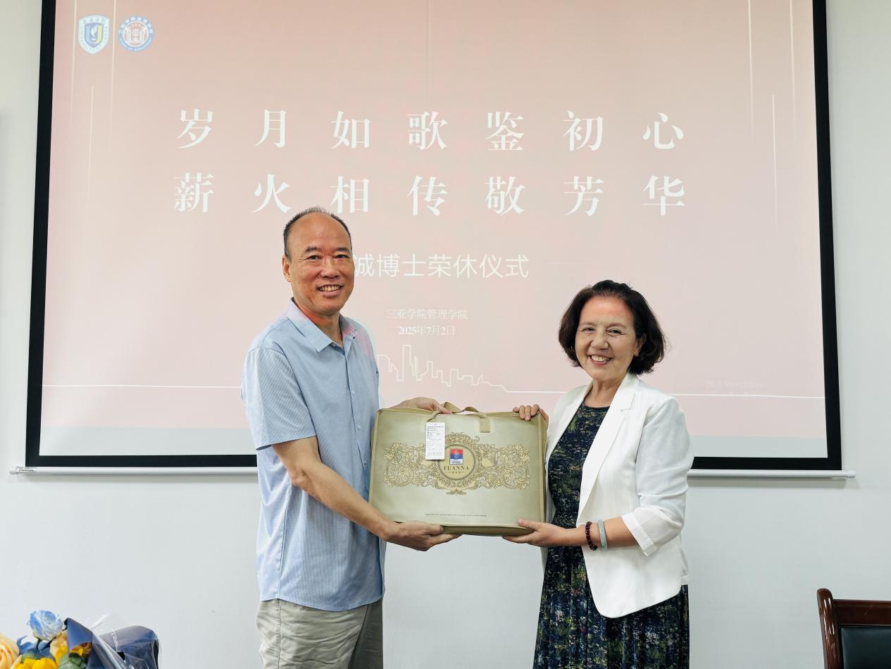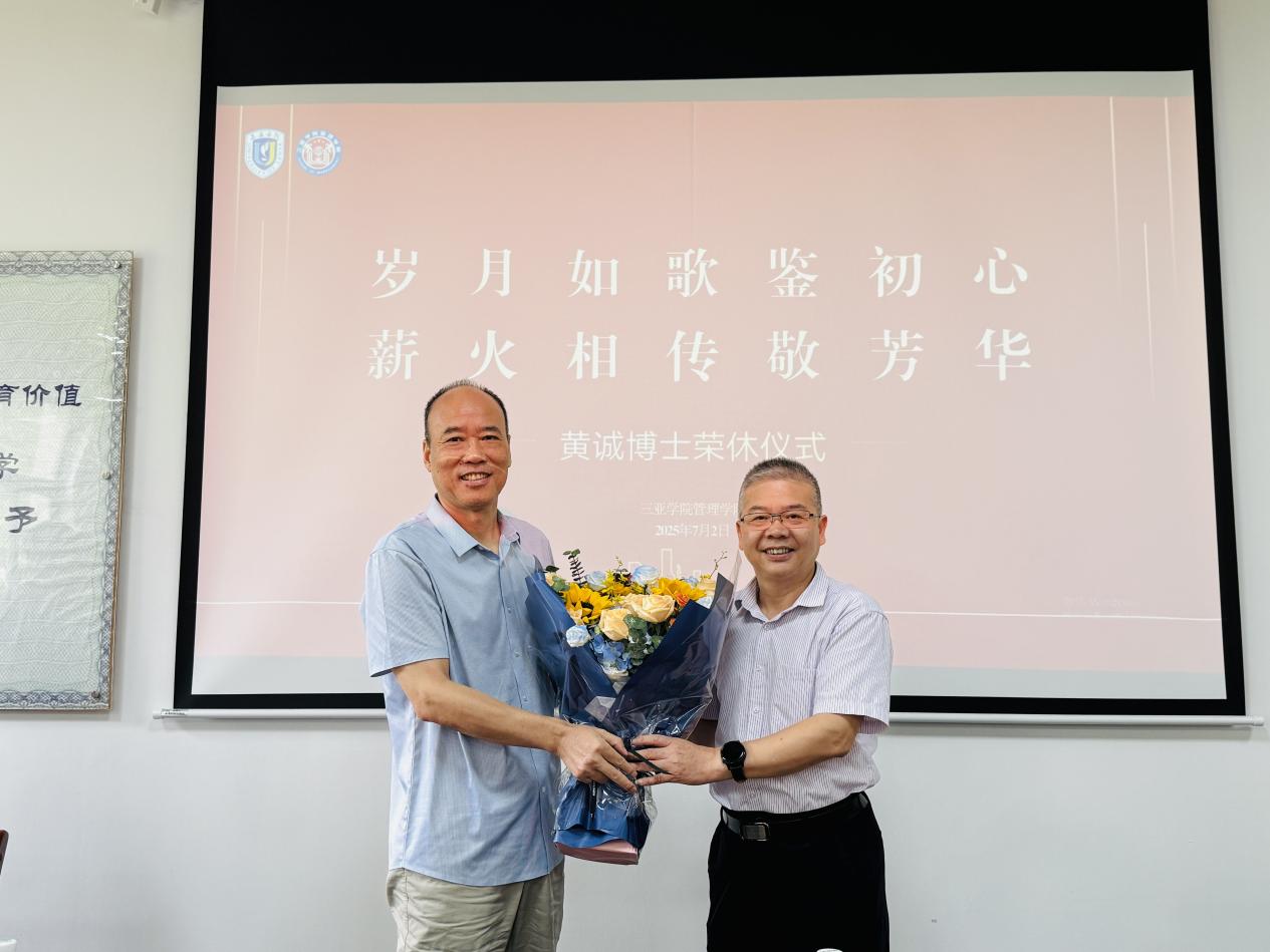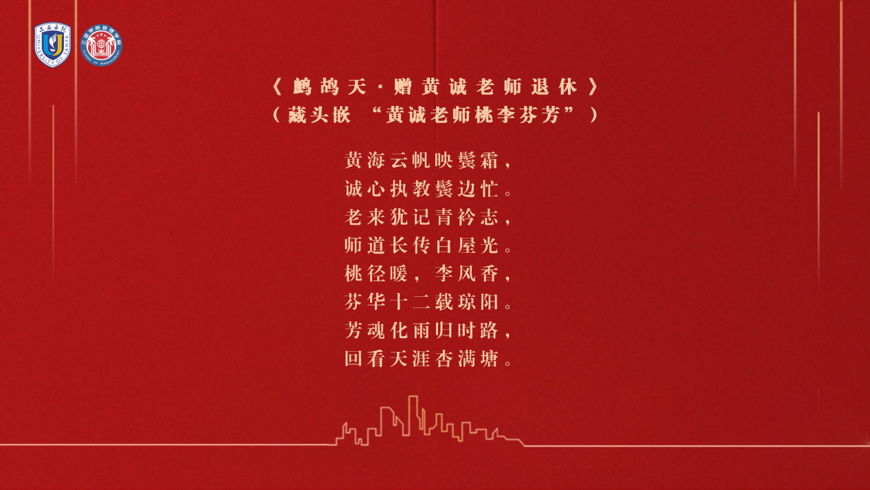 黄诚博士在感言中深切致谢学院的培养与同仁情谊,寄语青年师生坚守教育初心。院长王云凤教授以藏头诗《鹧鸪天·赠黄诚老师退休》致敬其育人生涯:“黄海云帆映鬓霜,诚心执教鬓边忙。老来犹记青衿志,师道长传白屋光。桃径暖,李风香,芬华十二载琼阳。芳魂化雨归时路,回看天涯杏满塘”——“黄诚老师桃李芬芳”八字藏头,凝练其十二载琼崖育才的灼灼芳华。