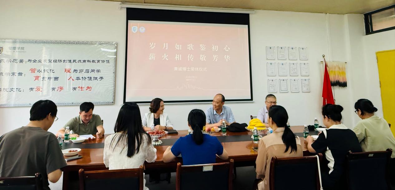 2025年7月2日下午,管理学院于206会议室举行“岁月如歌鉴初心 薪火相传敬芳华——黄诚博士荣休仪式”。院长王云凤教授、原党总支书记戴盛才教授、院长助理张成甦副教授、市场营销专业教师代表、学院办公室代表共十余人齐聚一堂,共同见证这一庄重而温暖的时刻。仪式由管理学院党总支副书记陶信伟主持。