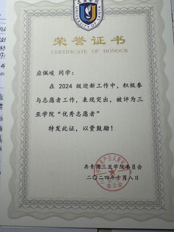 图3:应佩峻同志荣获2024年迎新工作“优秀志愿者”荣誉称号
