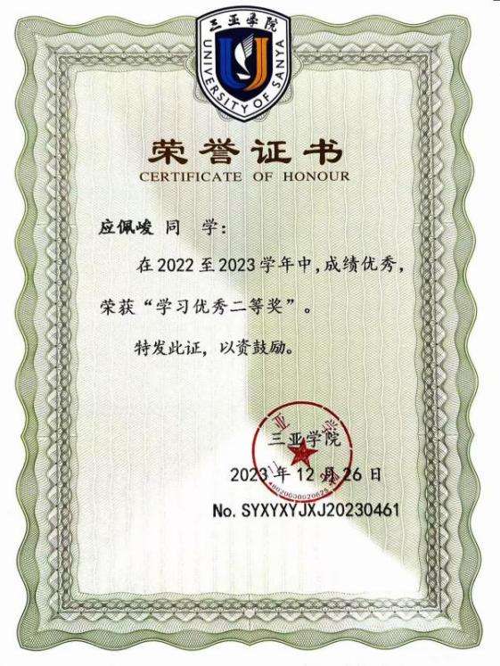 | 三亚学院“学习优秀二等奖”