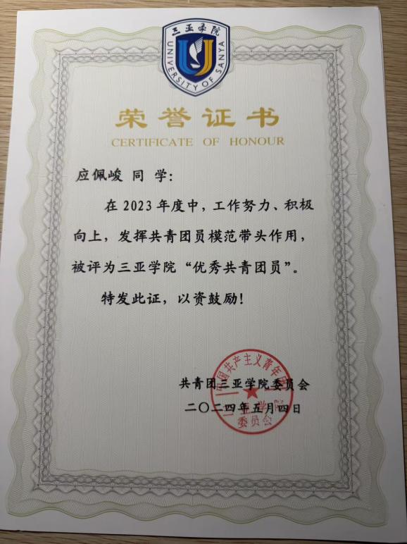三亚学院“优秀共青团员”荣誉称号