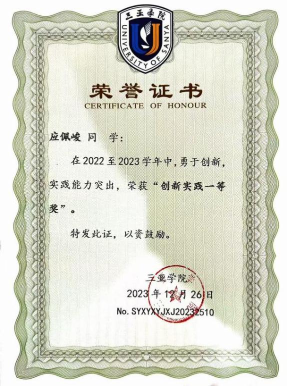三亚学院“创新实践一等奖”