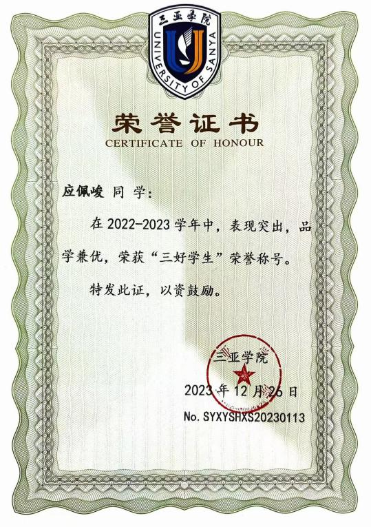 | 三亚学院“三好学生”荣誉称号
