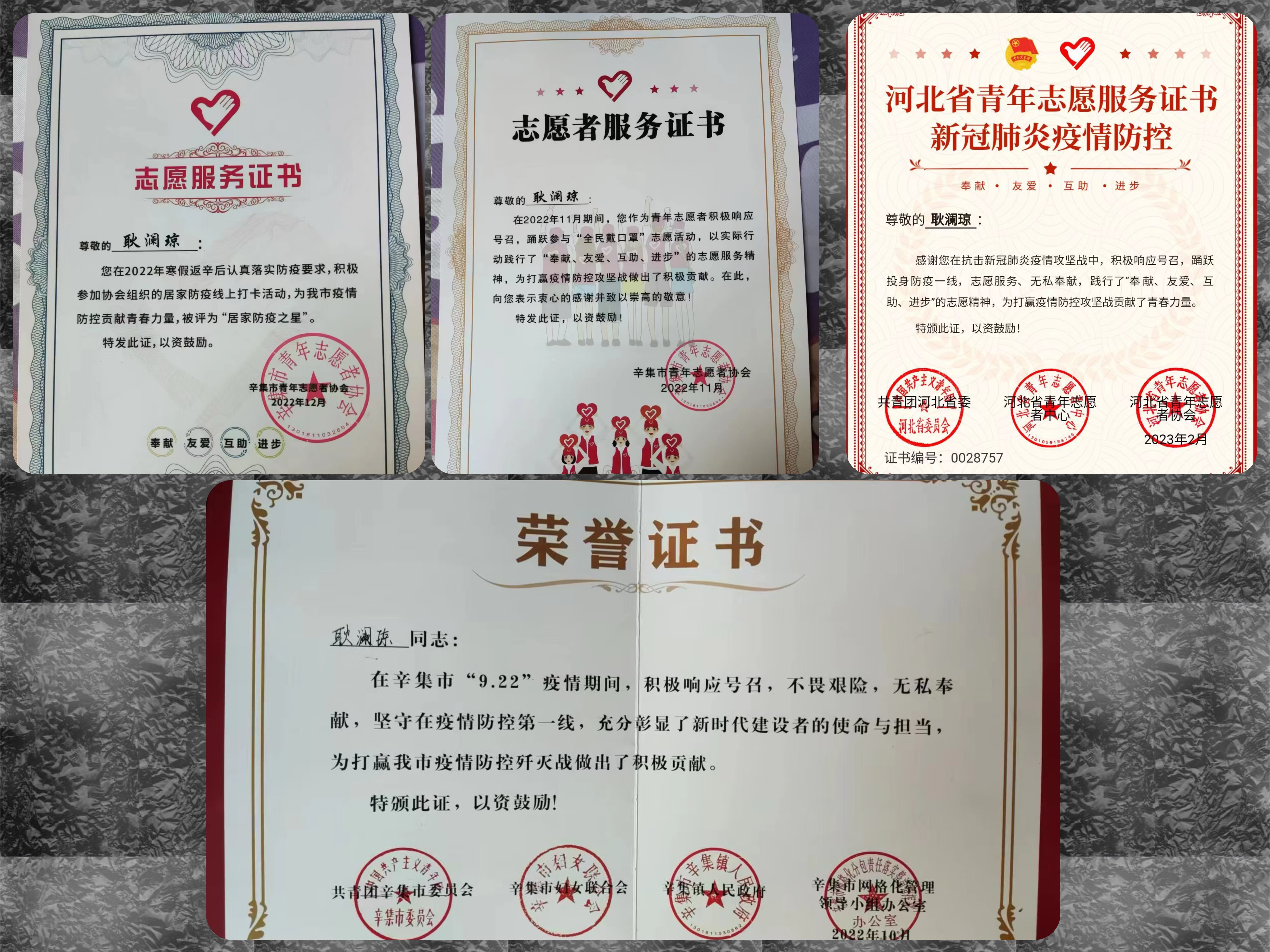 耿澜琼同学多次获得“志愿服务”荣誉证书