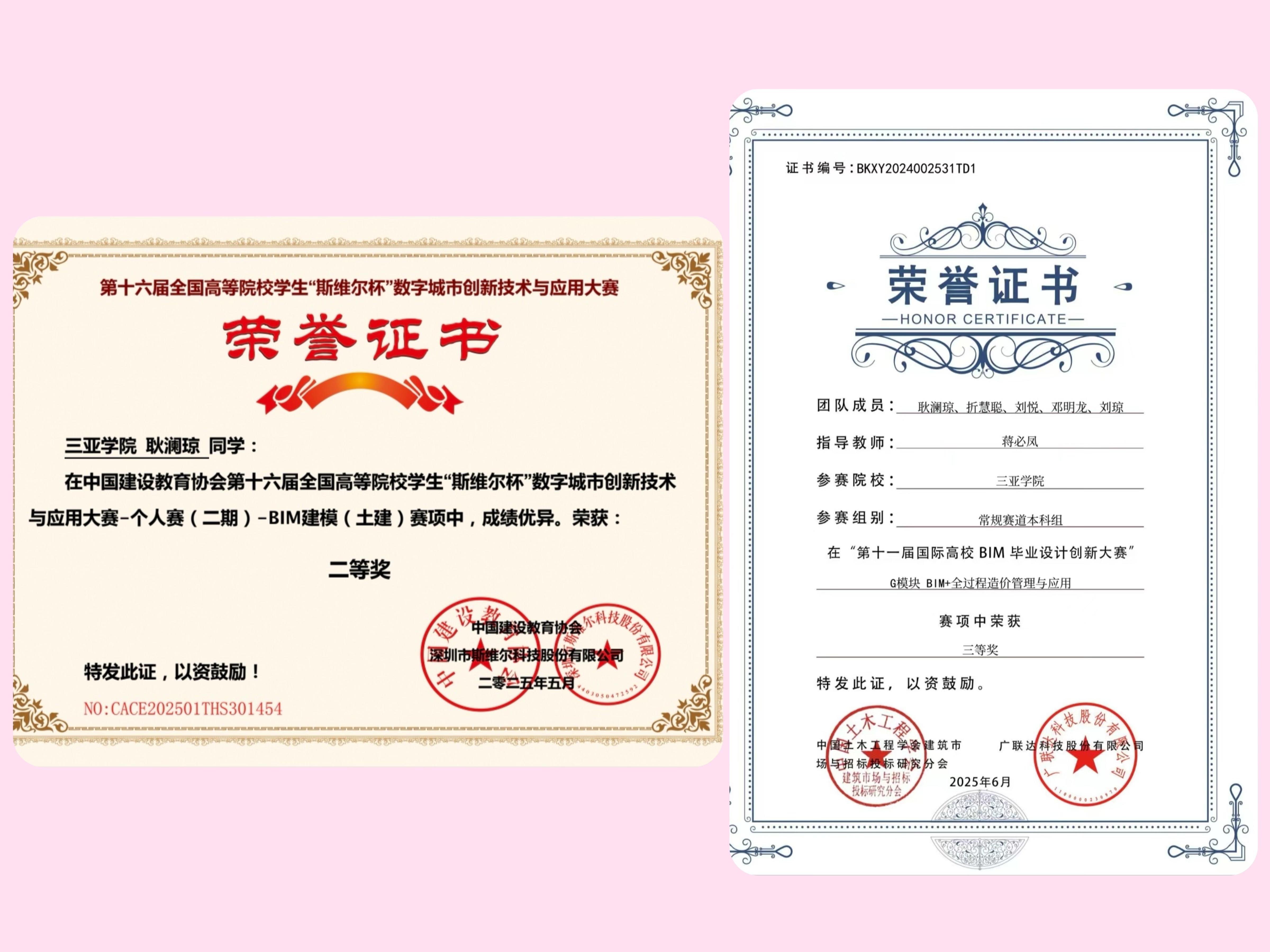 在数字化建造的前沿领域,她宛如一颗冉冉升起的新星。在第16届全国高等院校学生“斯维尔杯”数字城市创新技术与应用大赛中,她凭借对行业尖端技术的深入理解和灵活运用,勇夺二等奖;在第11届国际高校BIM毕业设计创新大赛中,再次展现非凡实力,斩获三等奖。这两项国家级大奖,不仅是对她技术功底的高度认可,更是她驾驭行业前沿能力的有力证明。