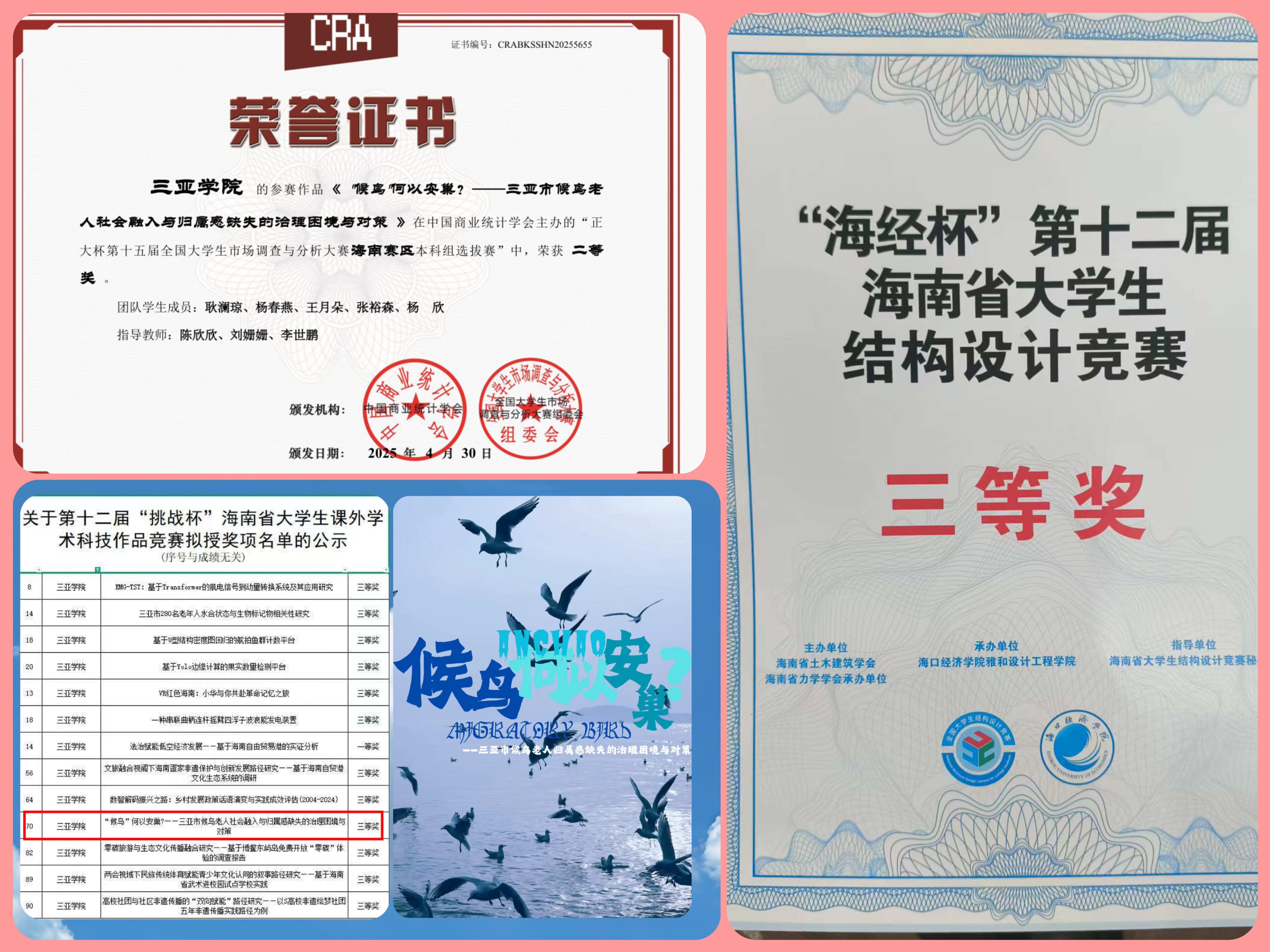 然而,耿澜琼的学科能力版图远不止于此。在市场洞察与商业分析领域,她凭借敏锐的商业嗅觉和扎实的分析能力,荣获“正大杯”第15届全国大学生市场调查与分析大赛海南赛区二等奖;在科技创新与实践方面,她以创新思维和勇于探索的精神,荣获第12届“挑战杯”海南省大学生课外学术科技作品竞赛三等奖;在专业核心技能比拼中,她亦毫不逊色,将海经杯第12届海南省大学生结构设计竞赛三等奖收入囊中。