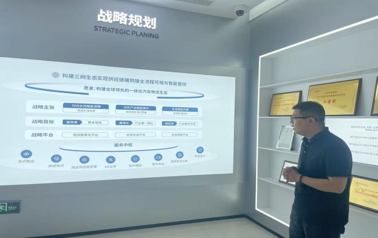 刘春放等教师一行人通过展厅参观系统地了解吉利物流在仓储自动化、运输协同化、供应链数字化领域的创新实践,教师团队对“智慧物流应用”“包装循环系统”等核心技术产生浓厚兴趣,吉速物流的董部长为我们做出详细的介绍。此外,董部长通过战略规划图详细解读了公司“构建三网生态实现供应链端到端全流程可视与智能管控”的战略核心。通过多式联运、跨境物流、精益供应链管理等创新模式,公司正朝着“全球领先的一体化汽车物流生态”的愿景稳步迈进。