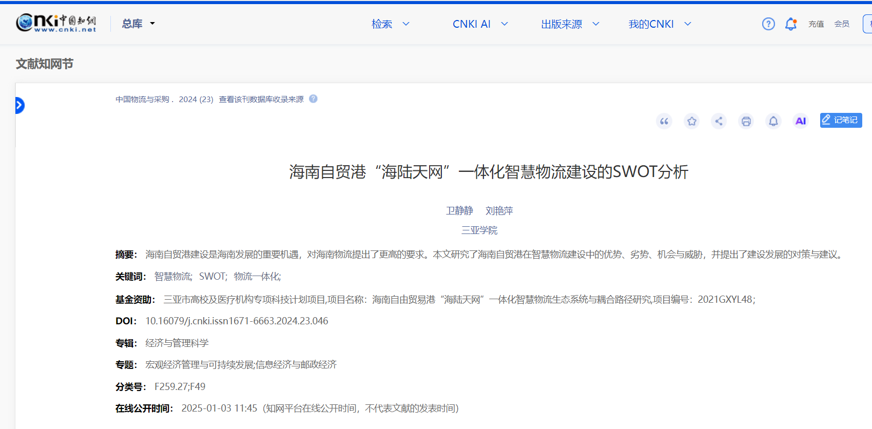本学年,管理学院卫静静老师在学术研究领域取得重要成果,她以第一作者身份撰写的论文《海南自贸港“海陆天网”一体化智慧物流建设的SWOT分析》在权威学术期刊上正式发表。该论文聚焦海南自贸港智慧物流建设的战略规划,通过SWOT分析法深入探讨了海南自贸港在“海陆天网”一体化智慧物流建设中的优势、劣势、机遇与挑战,为海南自贸港物流体系的高质量发展提供了理论依据和实践指导。