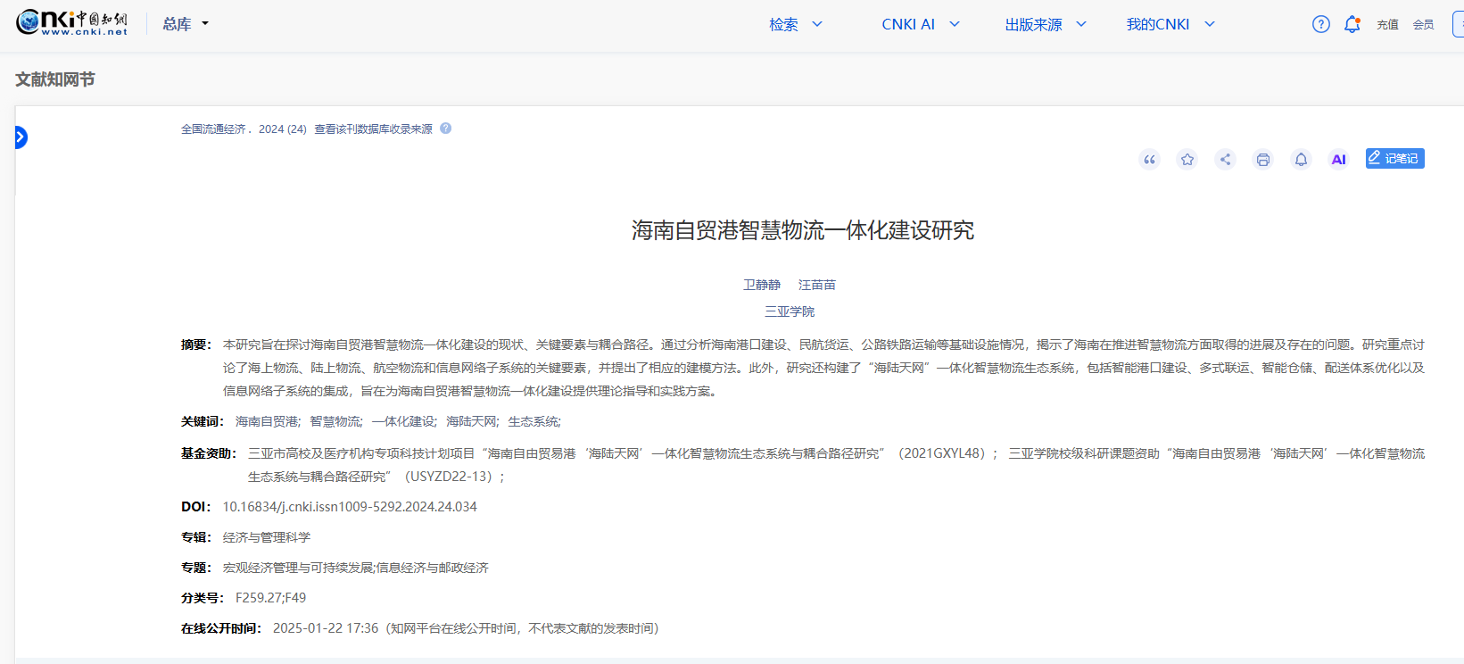 随着海南自贸港建设的深入推进,物流作为自贸港经济发展的重要支撑,其智慧化、一体化发展已成为亟待解决的问题。卫静静和汪苗苗老师的研究以智慧物流为核心,结合海南自贸港的区位优势和政策红利,提出了一套基于物联网、大数据、人工智能等技术的智慧物流一体化建设方案,旨在提升物流效率、降低运营成本、优化资源配置。