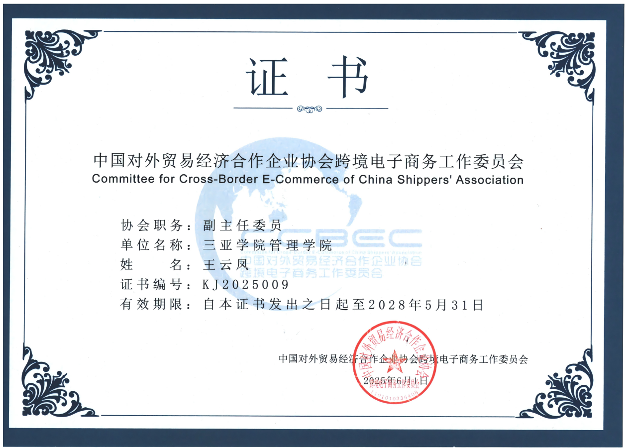 王云凤院长在电子商务、国际贸易及企业管理领域拥有丰富的学术研究和实践经验。她长期致力于跨境电子商务的研究与教学,发表了多篇具有影响力的学术论文,并积极参与多项国家级和省部级科研项目。此次担任跨境电子商务工作委员会副主任委员,王云凤院长将凭借其深厚的学术背景和实践经验,为推动中国跨境电子商务的健康发展贡献力量。