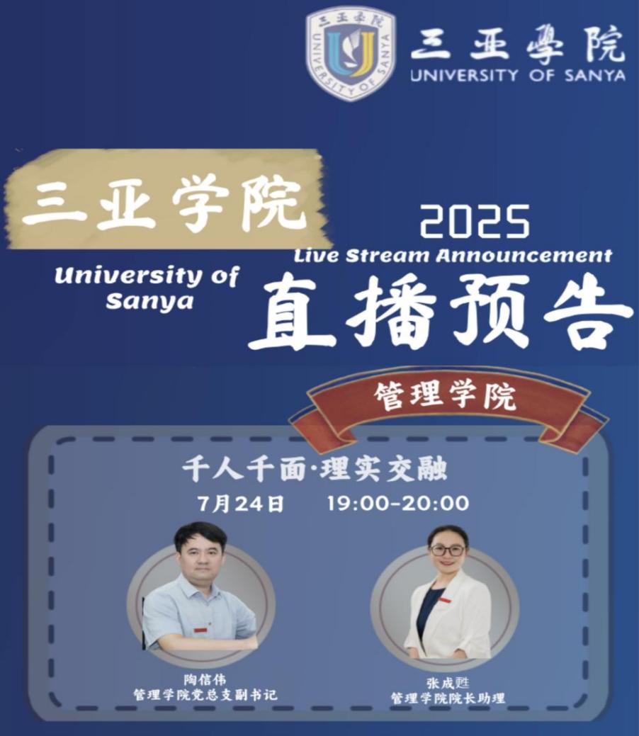 为了让众多考生、家长们能更好地了解管理学院,全方位展示学院办学成果、专业魅力及发展前景,管理学院于7月24日19:00在三亚学院官方抖音号成功举办以“千人千面 理实交融”为主题的招生专题直播,吸引了众多考生和家长的关注和参与。