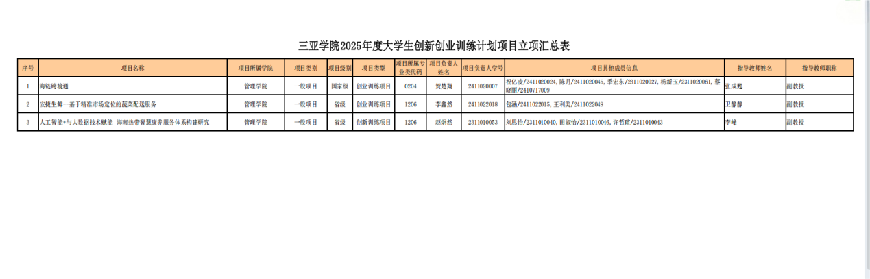 近日,海南省教育厅公布了2025年度海南省大学生创新训练计划项目立项名单。三亚学院管理学院有3个大学生创新创业训练计划项目获批立项,其中国家级1项,省级2项。彰显了学院在双创教育方面的卓越成效。